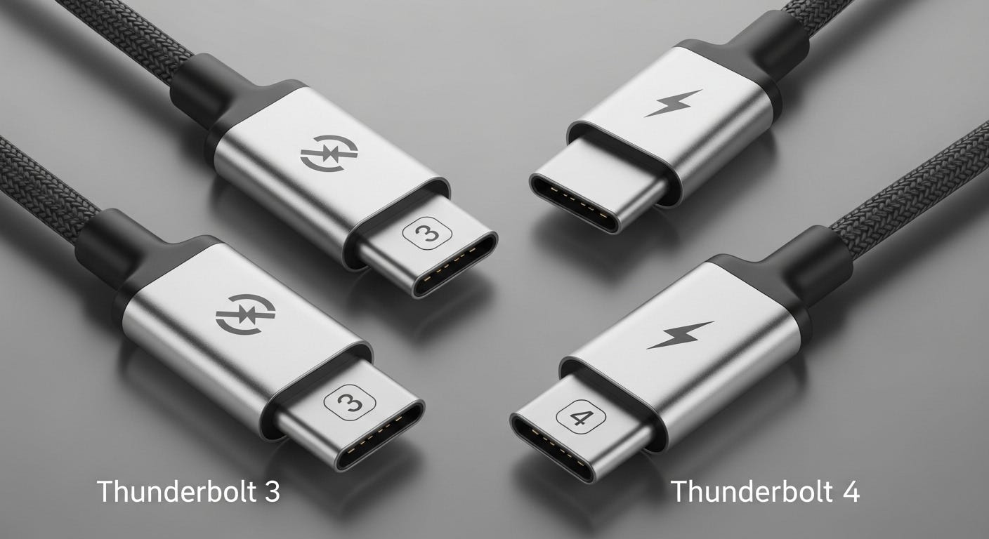 The most common are Thunderbolt 3 and Thunderbolt 4. Both use USB-C connectors, but Thunderbolt 4 guarantees higher minimum performance standards.