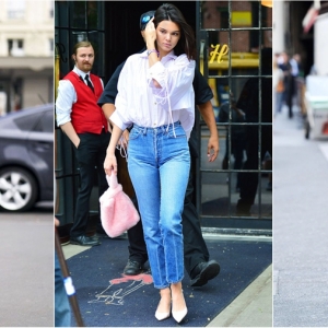 While out shopping with friends, she wore another coded look with a collarless black leather jacket, white jeans, and another band. Finish with cozy casere socks and corded bag for that model off...