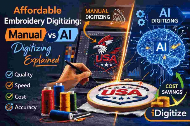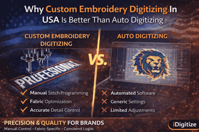 Custom embroidery digitizing in USA provides full manual control over stitch direction, underlay, density, and fabric behavior. This guide explains why custom digitizing outperforms auto digitizing in quality, efficiency, and long-term production reliability.